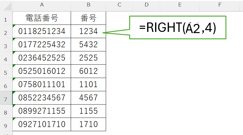 セルA2からA9の各電話番号の下4桁を抜き出し、結果をB2からB9に表示します。