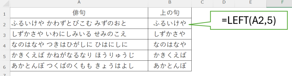 セルA2からA6の各俳句の神5桁を抜き出し、結果をB2からB6に表示します。