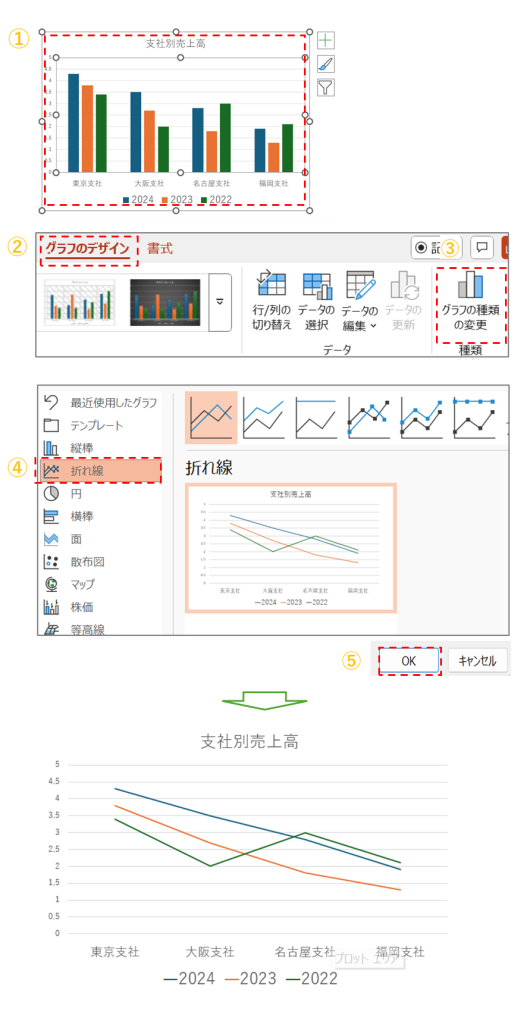 ④適切なグラフを選択して、⑤「OK」をクリックします