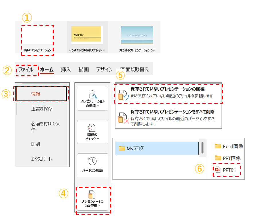 ⑤「保存されていないプレゼンテーションの回復」をクリックします。