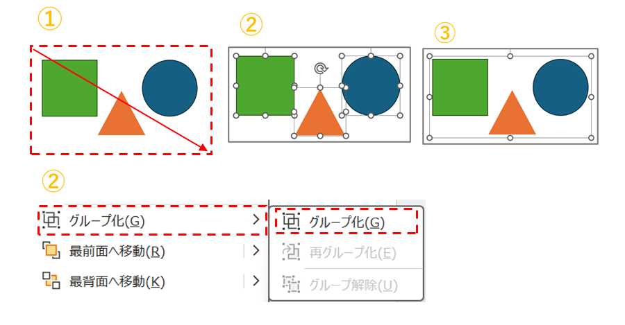 ①グループ化したい図形が全て含まれるようにドラッグします。