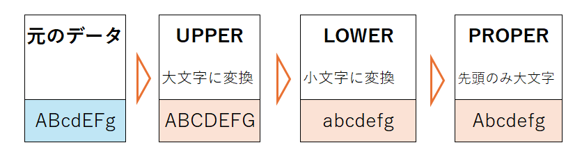 UPPER、LOWER、PROPER関数は、文字列内のアルファベットの大文字・小文字を変換するために使用されます。