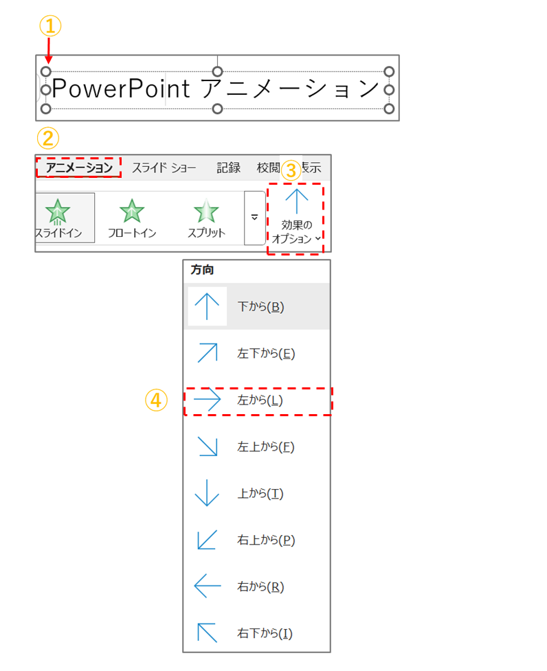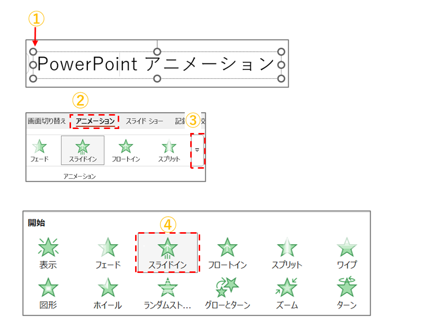④一覧表の中から適用したいアニメーション(スライドイン)を選択します
