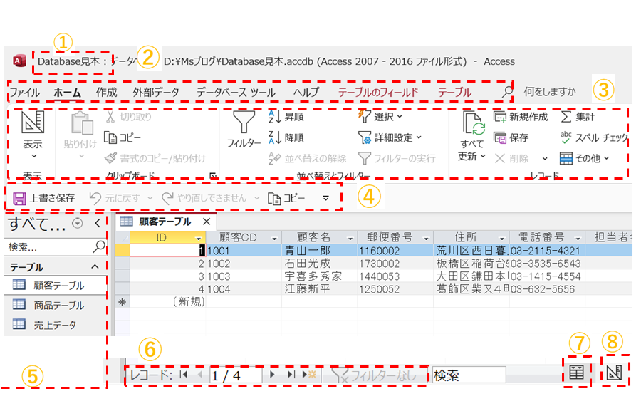 ⑤ナビゲーションウインドウ:オブジェクトが表示されます