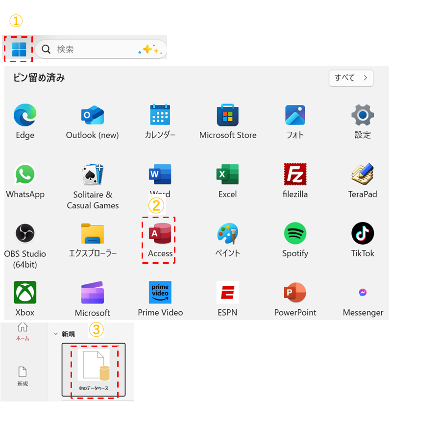 ③新規のデータペースを開くには、「空のデータベース」をクリックします
