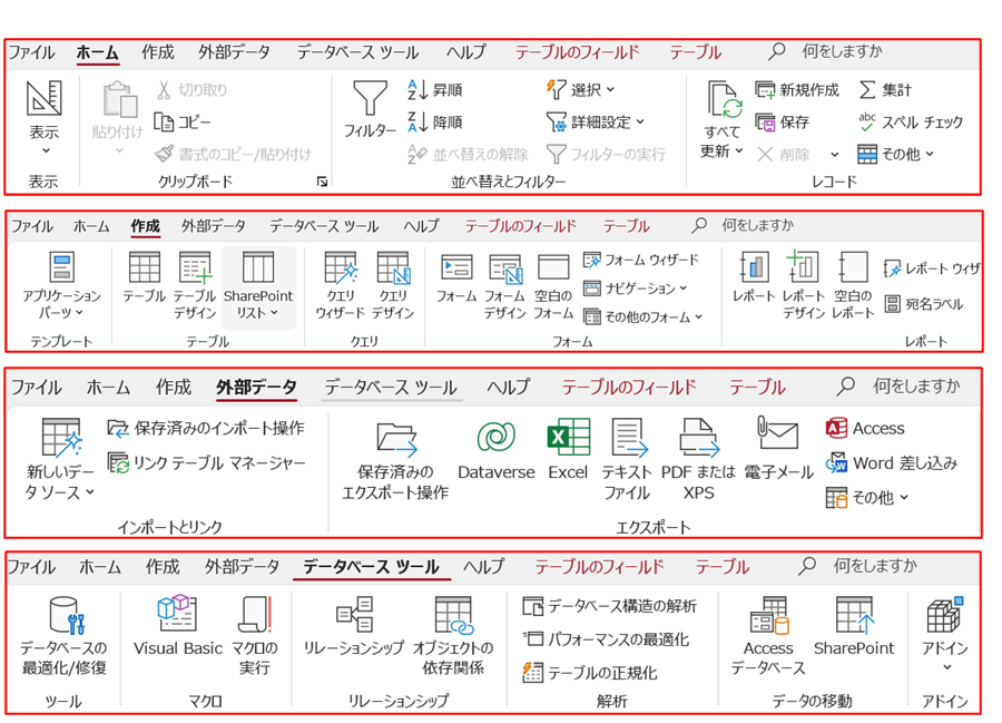 タブの種類は「ファイル」タブ、「ホーム」タブ、「作成」タブ、「外部データ」タブ、「データベースツール」タブなどがあり、それぞれのタブには各リボンが配置されています。