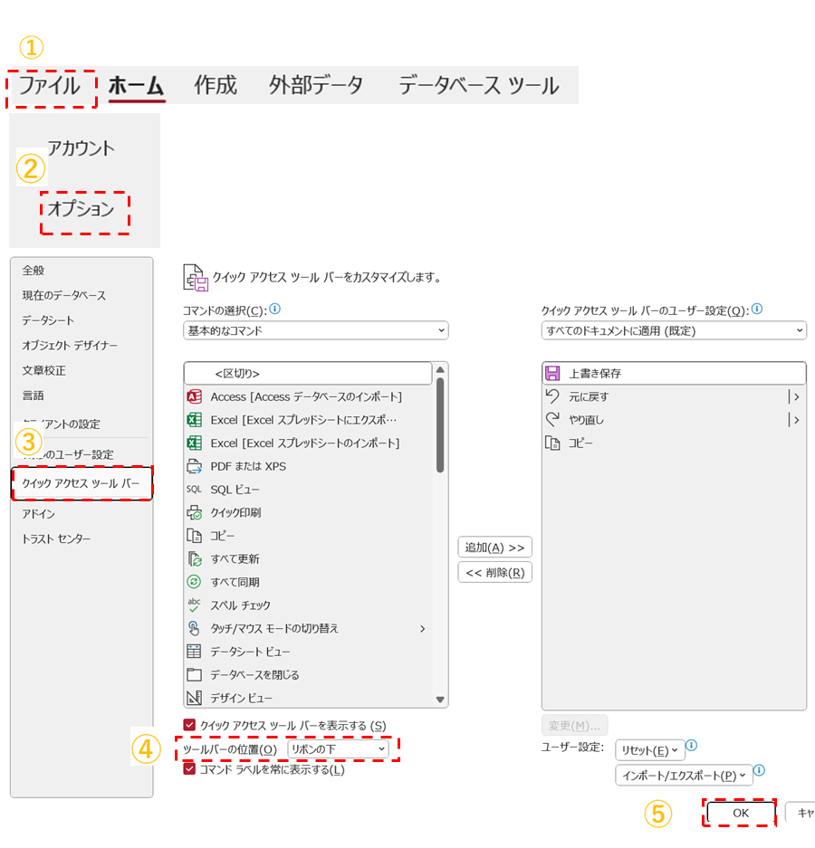 ④クイックアクセスツールバー:使用頻度の高いボタンを表示します