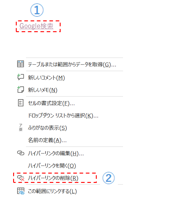 ①ハイパーリンクを解除したいセルを選択し右クリックする