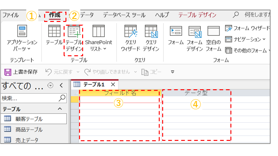③「フィールド名」を入力し、④「データの型」を指定します。