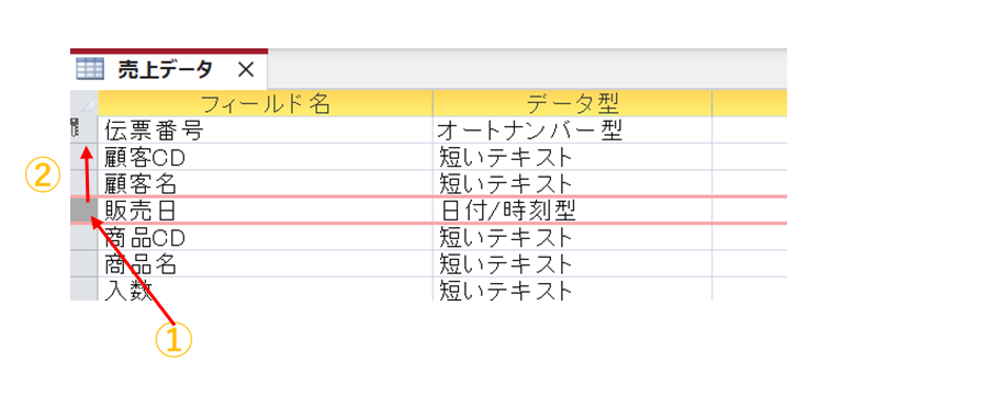 ①入れ替えるフィールドの行セレクターをクリックし、②移動先に向かってドラックします、
