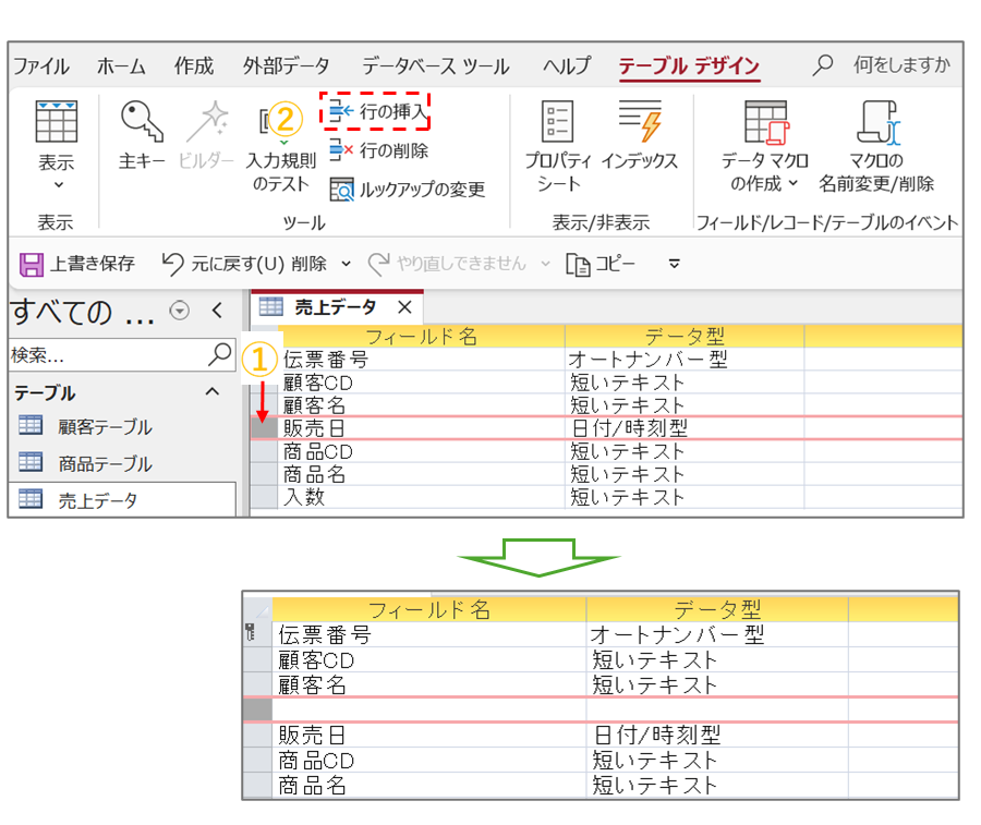 設計したテーブルをデザインビューで登録した後に変更(順番の入れ替え、追加、削除)が発生した場合の操作を行います。