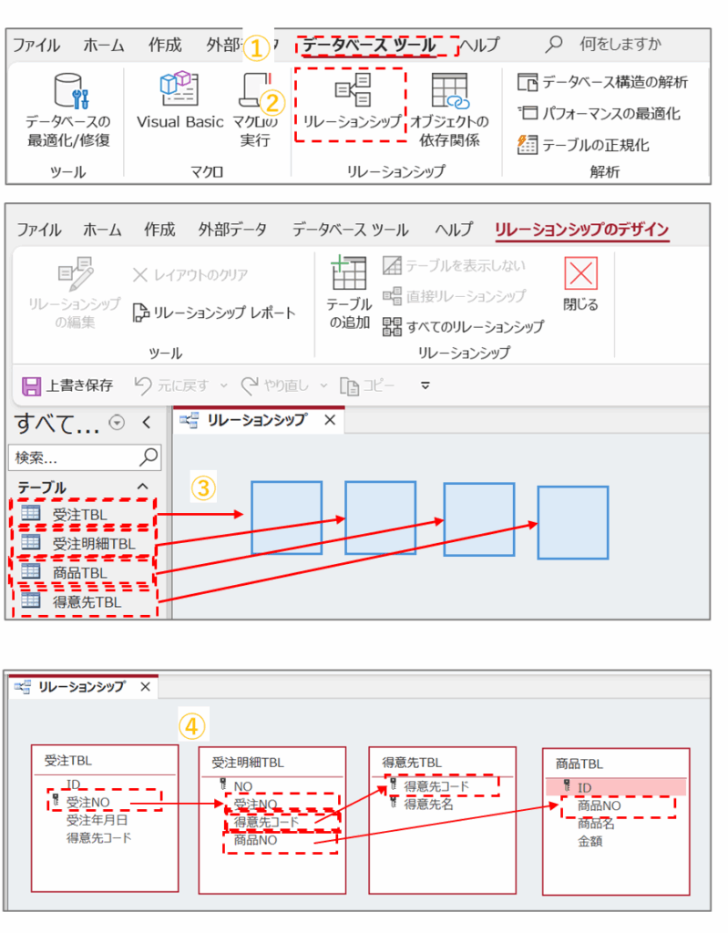 「ここでは受注TBL、受注明細TBL、得意先TBL、商品TBLとします」