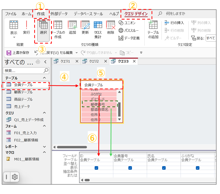 ②「クエリデザイン」を選択して、「選択クエリ」をクリックします