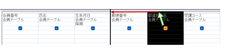 削除したいフィールド枠の上部にカーソルを合わせると黒矢印が表示されたら、クリックすると、黒色に変わり、「Delete」キーを押すと、削除されます