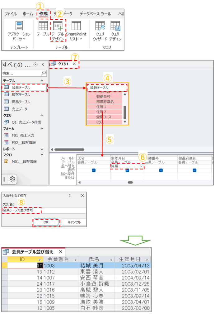 会員テーブルの生年月日の若い順に並び替える方法です。