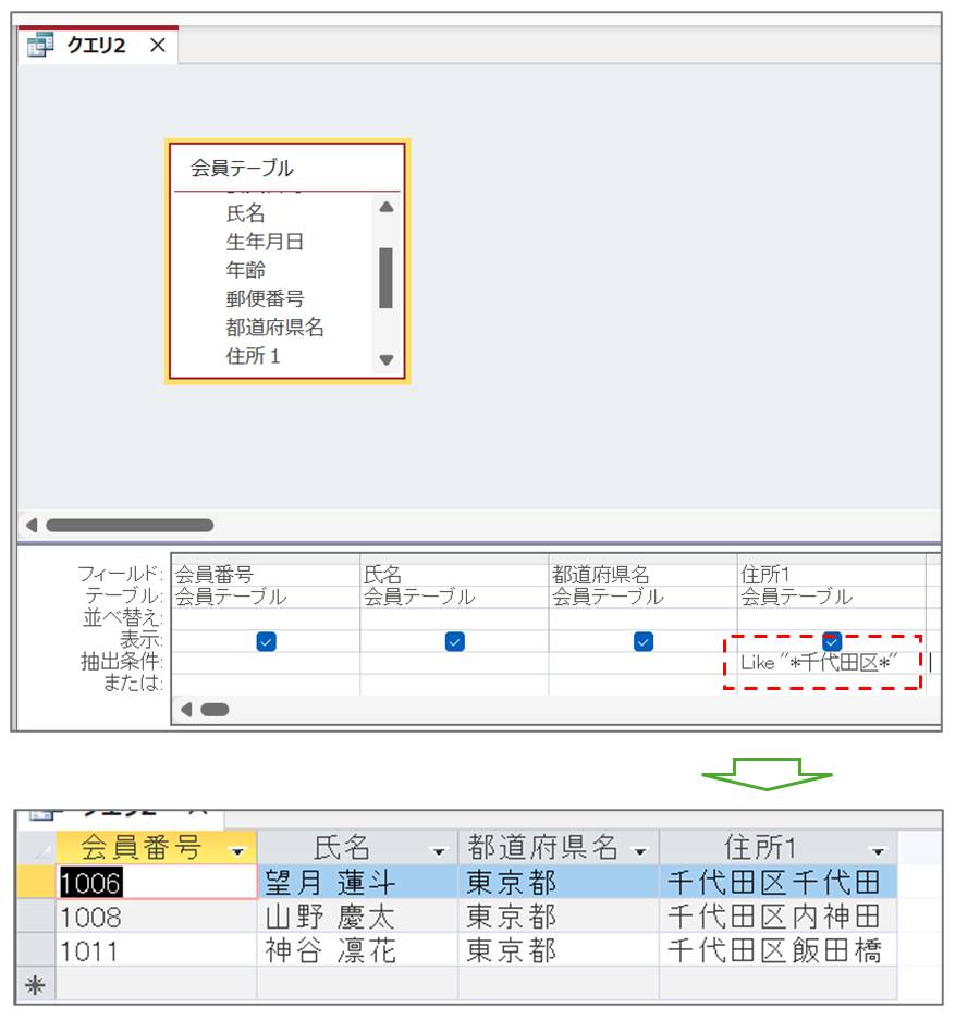 会員テーブルの住所1が「千代田区」を含むデータを表示します。