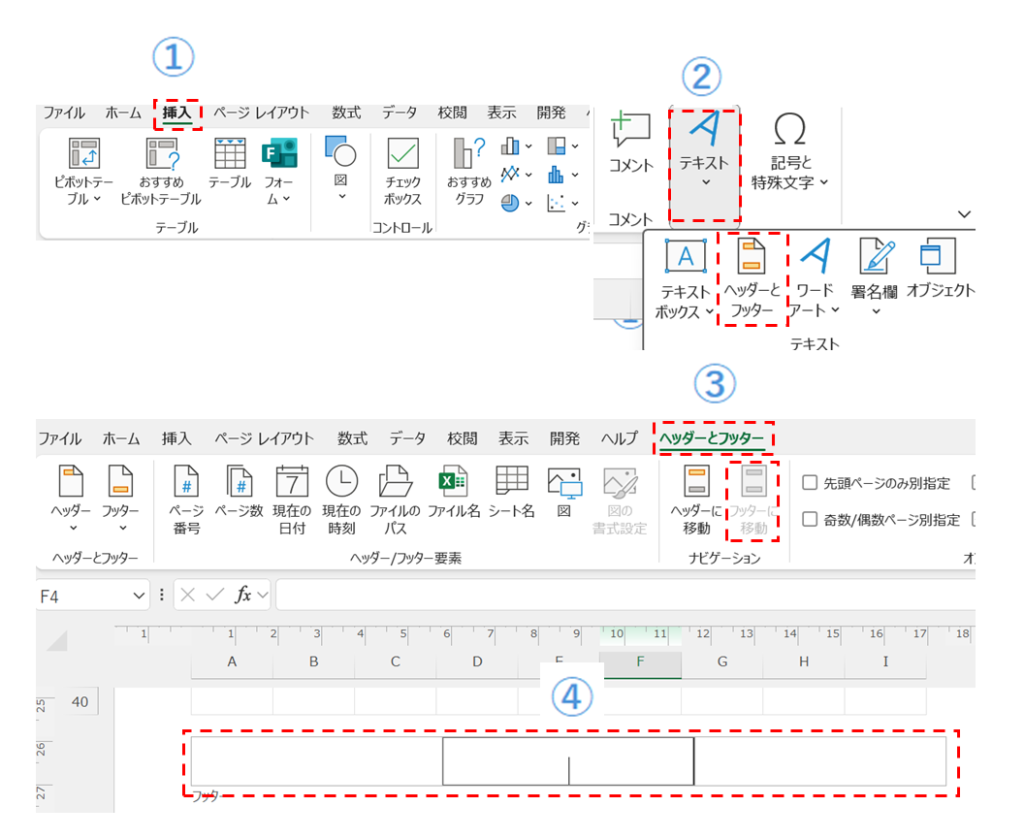③[ヘッダーとフッター]タブの [ナビゲーション]グループより[フッターに移動]を選択する