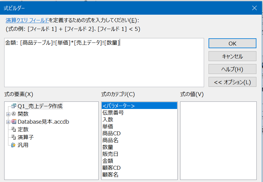 式ビルダーは、フォームのコントロール、レポート、クエリ、テーブルのフィールドなどで計算フィールドや条件式を作成する際に、複雑な式を簡単に組み立てるためのツールです。