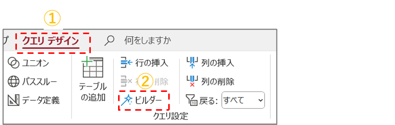 ①デザイン」タブの「クエリ設定」グループにある②「ビルダー」ボタンをクリックします