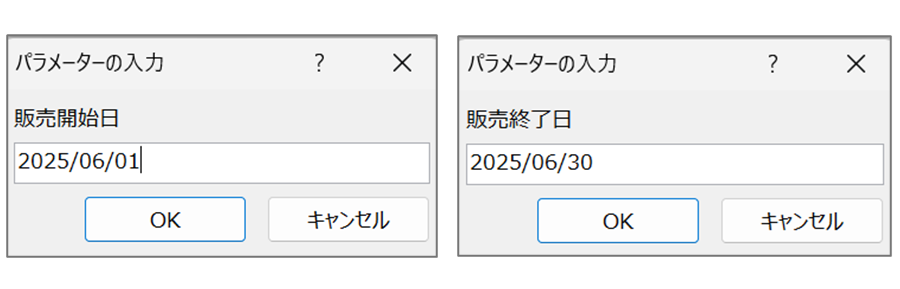 パラメータ: [開始日を入力してください]、[終了日を入力してください]