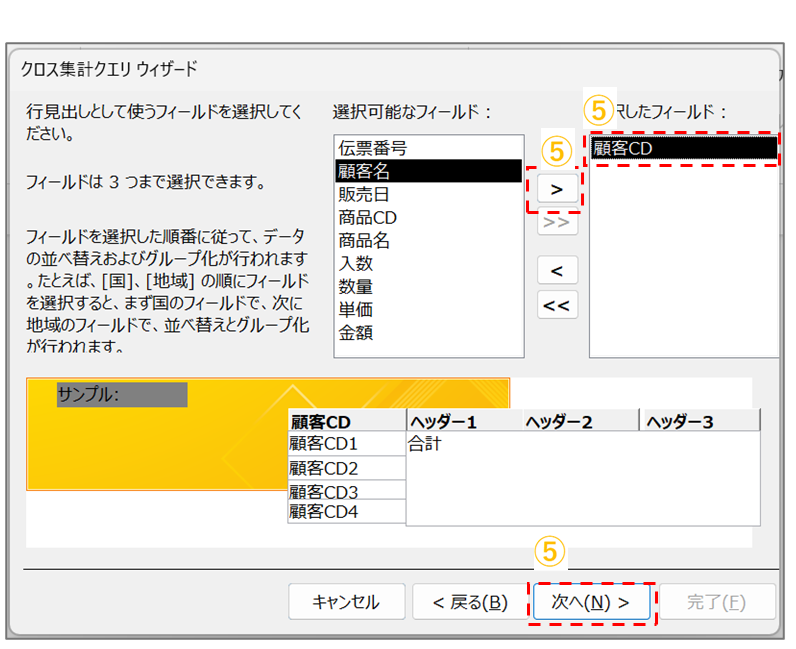 行見出しとして、⑤得意先CDを選択して、右矢印「>」をクリックして、「次へ」をクリックします