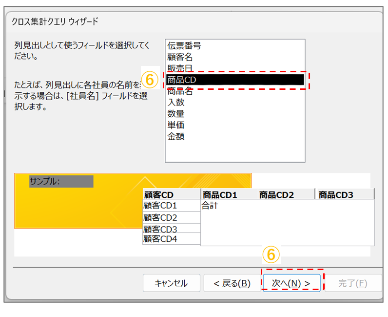 列見出しとして、⑥商品CDを選択して、「次へ」をクリックします