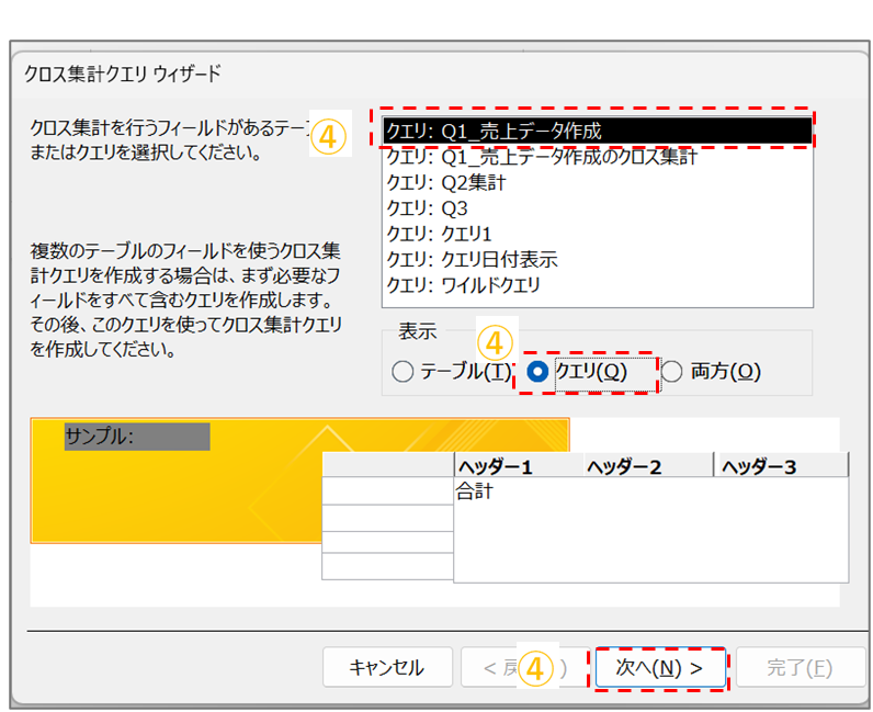 クロス集計ウイザードより、④クエリを選択して、クエリ名「Q1-売上データ」を選択して、次へをクリックします