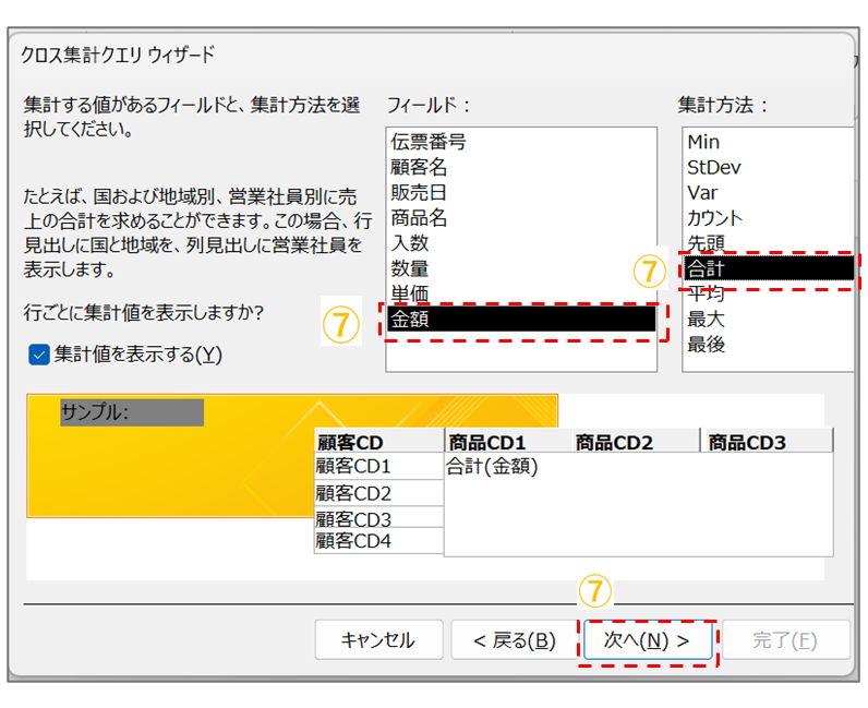 集計するフィールドを⑦金額を選択して、集計方法を合計を選択して、「次へ」をクリックします
