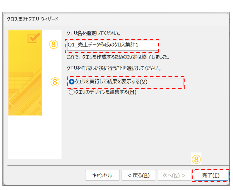 ⑧クエリ名を指定して、クエリを実行して結果を表示するを選択して、完了をクリックします。