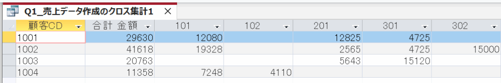 ここではクエリの「Q1-売上データ」をもとに、得意先別、商品別に金額の合計を求める集計表とします。