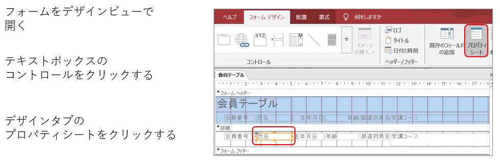 コントロールはデザインタブのコントロールグループにあるボタンをクリックして追加します。