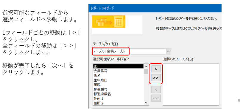 テーブルまたはクエリを指定して、フィールドを選択するものです。