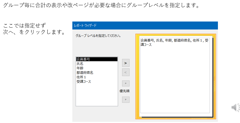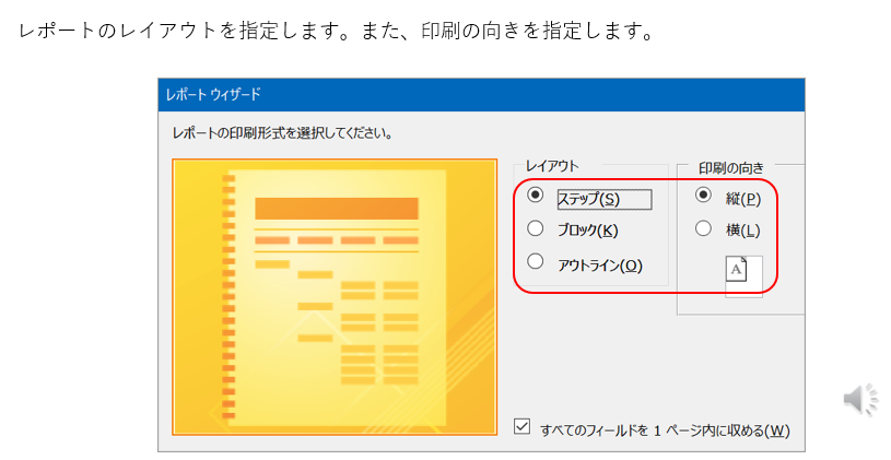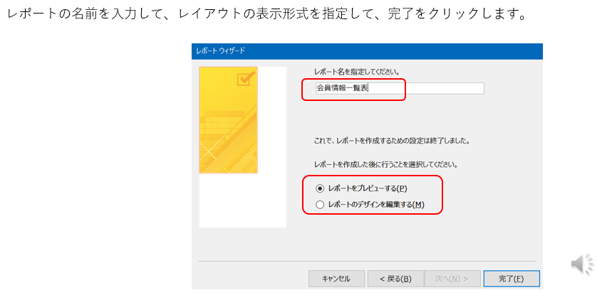 レポートウィザードの過程でレポートやクエリを指定し、レポートのレイアウトなどを選択します。