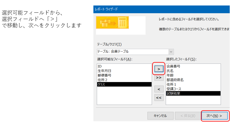 レポートに表示するフィールを指定
