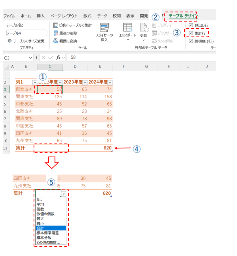 ②「テーブルデザイン」タブの③「集計行」にチェックを入れる
