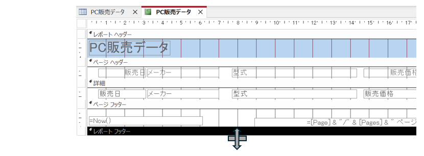 レポートフッターをクリックし、境界線にか―ソルを合わせるとマウスポインタが十字に変わります。下にスライドして、領域を広げます。