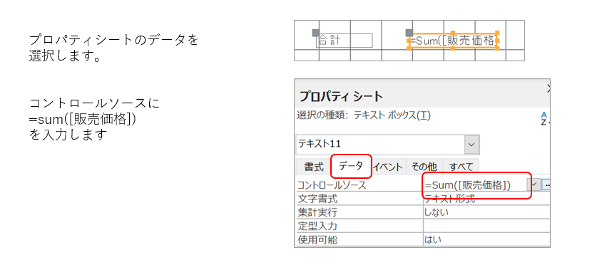 テキストボックスのプロパティシートを開き合計を計算するための関数を入力します。