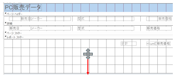レポートフッターをクリックし、境界線にカ―ソルを合わせるとマウスポインタが十字に変わります。 下にスライドして、領域を広げます。