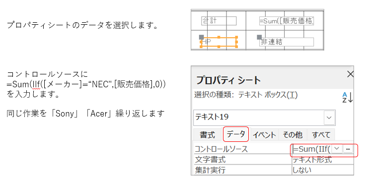 合計を求める方法は前のレッスンで学習しましたが、その内訳を求めるにはSUM関数の中にIIF分を記述すると求めることができます。