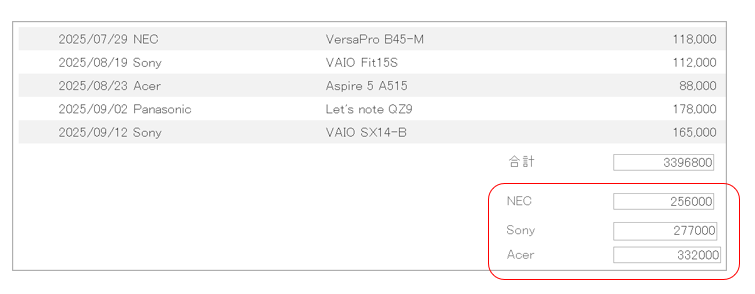 レポートフッターに合計の内訳としてNEC、Sony,Acerの合計が表示されました