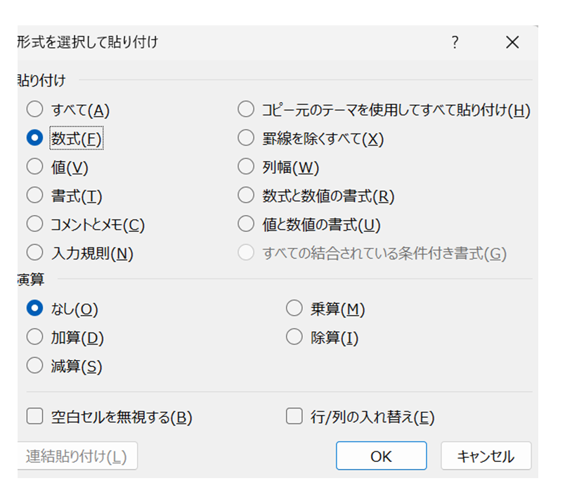 通常の貼り付け(Ctrl + V)では、コピー元のすべての情報がそのまま貼り付けられますが、「形式を選択して貼り付け」を使うことで、必要な情報だけを選んで貼り付けることができます。
