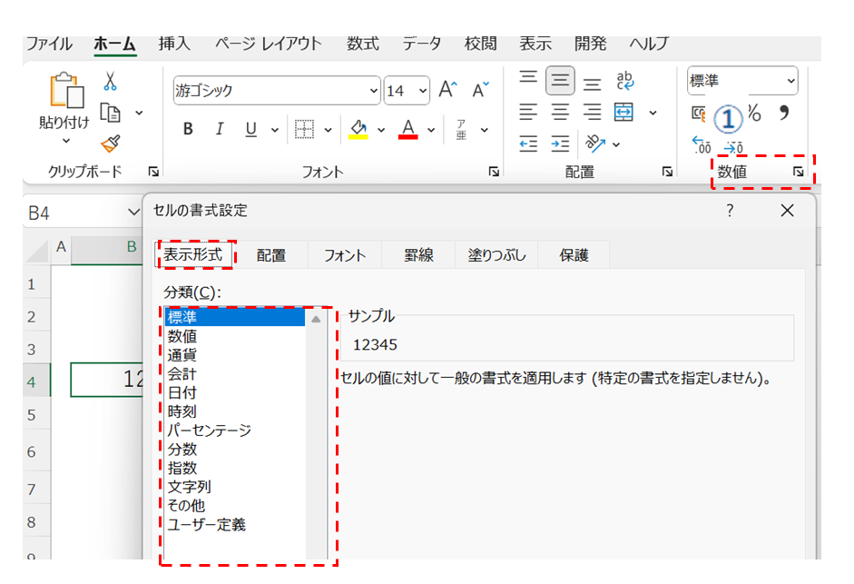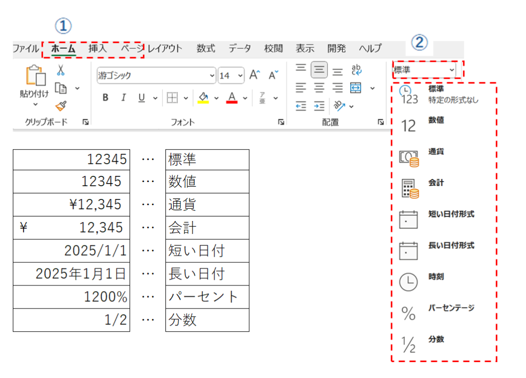 ホームタブから①「数値」グループの▼をクリックする