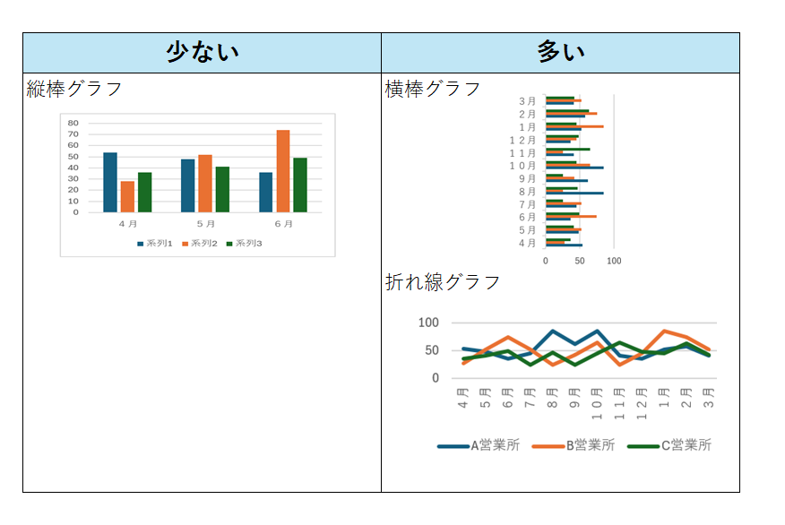 数量の比較に用いるグラフは主に縦横棒グラフと折れ線グラフです。