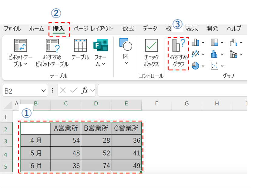 ①グラフ対象のデータの範囲を選択する