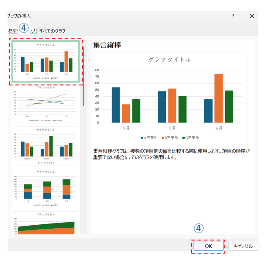 ④縦棒グラフを選択して、OKをクリックします。