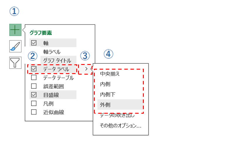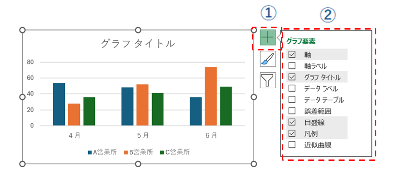 対象のグラフのグラフエリアをクリックして①グラフ要素をクリックする