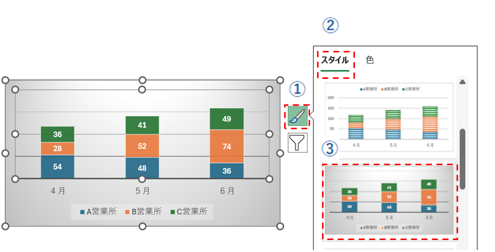 ②スタイルをクリックして、③お好みのスタイルをクリックする
