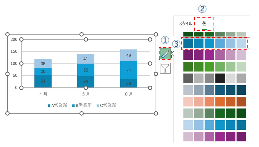 対象のグラフを選択して、グラフ右上の①「筆」をクリックする