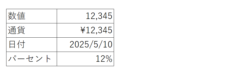データの表示形式には数値/通貨/日付/パーセンテージなどがあります