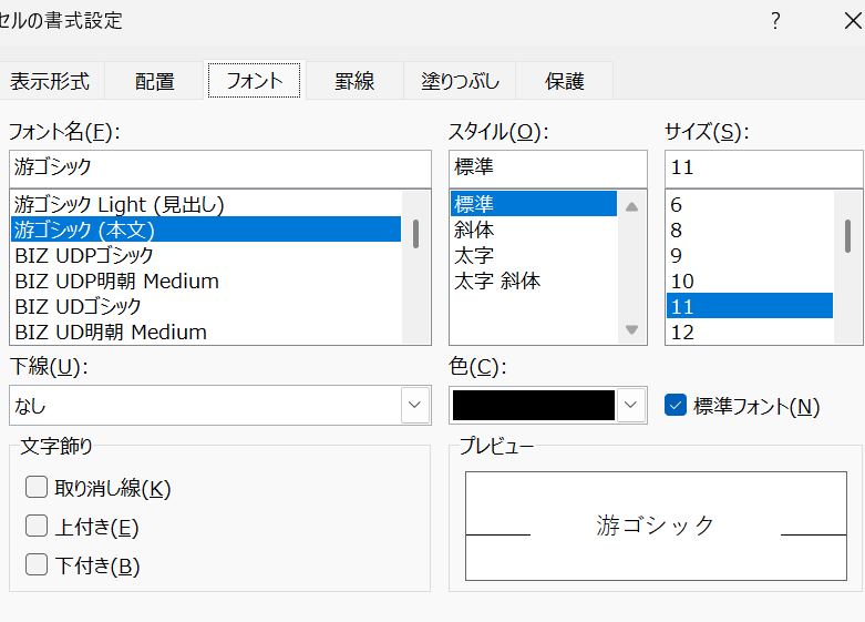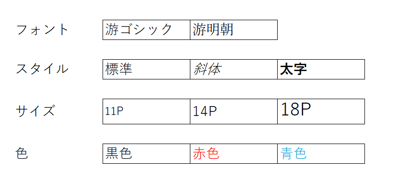 制定できるものは、「フォント名」「スタイル」「サイズ」「色」「下線や家財文字」があります